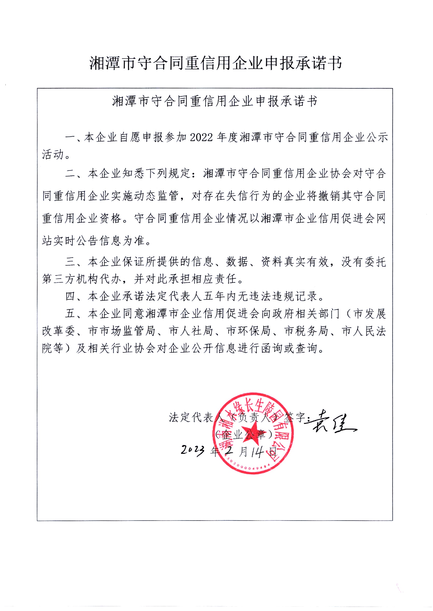 本企業(yè)根據(jù)《湘潭市守合同重信用企業(yè)申報規(guī)定》等編制 2022 年度企業(yè)信用報告書,并保證本報告書內(nèi)容真實(shí)、準(zhǔn)確、完整。